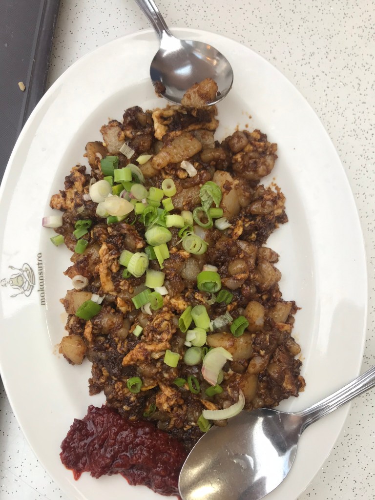 For our second morning in Singapore, we headed to the Tekka Food Centre for breakfast. There were a dazzling number of mainly Indian food options, although there were some Malay and Chinese stalls as well. We got egg and cheese prata, a freshly made fried dough pancake with a cracked egg and slice of cheese inside. It also included a little curry tomato dipping sauce.