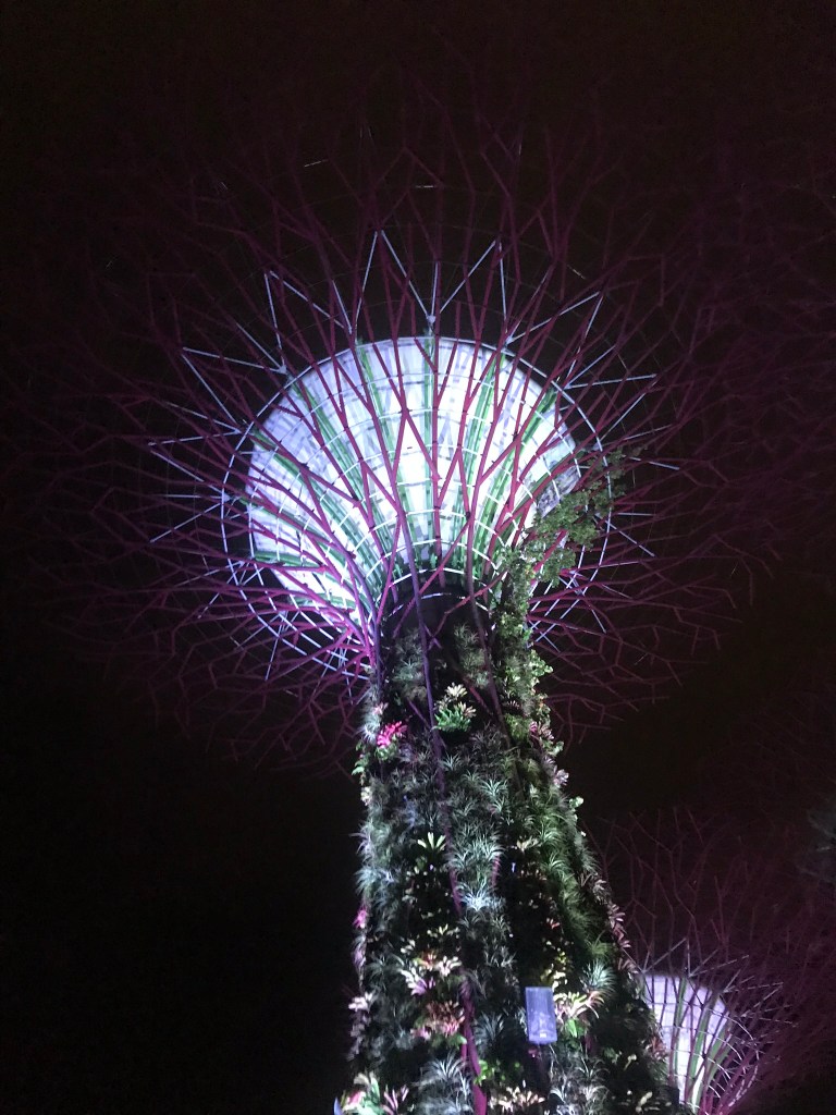 We walked into the Gardens by the Bay after dusk. The Gardens by the Bay is a nature park located right behind Marina Bay Sands, and is free entry. The famous tree towers were lit up with changing colors, and there was a free Toy-Story themed light show going on every half hour.