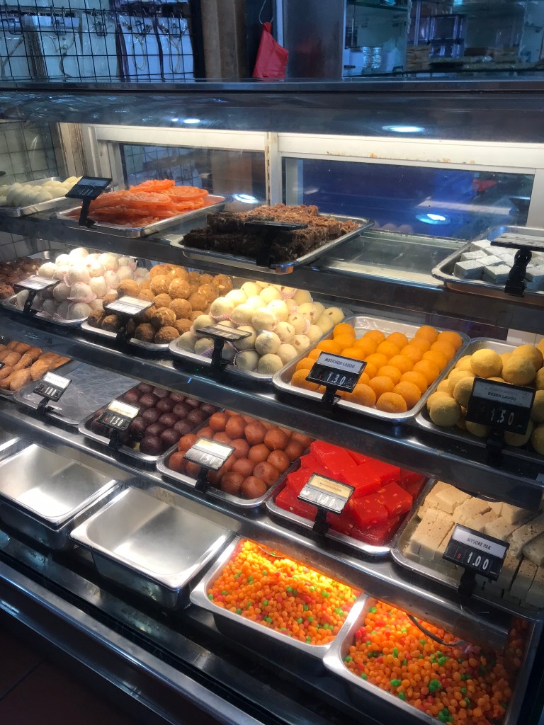 On our way to the hawker centre, we stopped by a small dessert shop, where they sold all kinds of Indian desserts, including peda cookies and gulab jamun (fried balls of dough drenched in rose syrup).